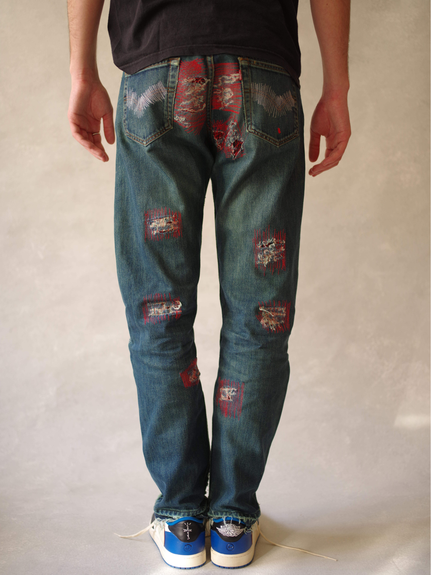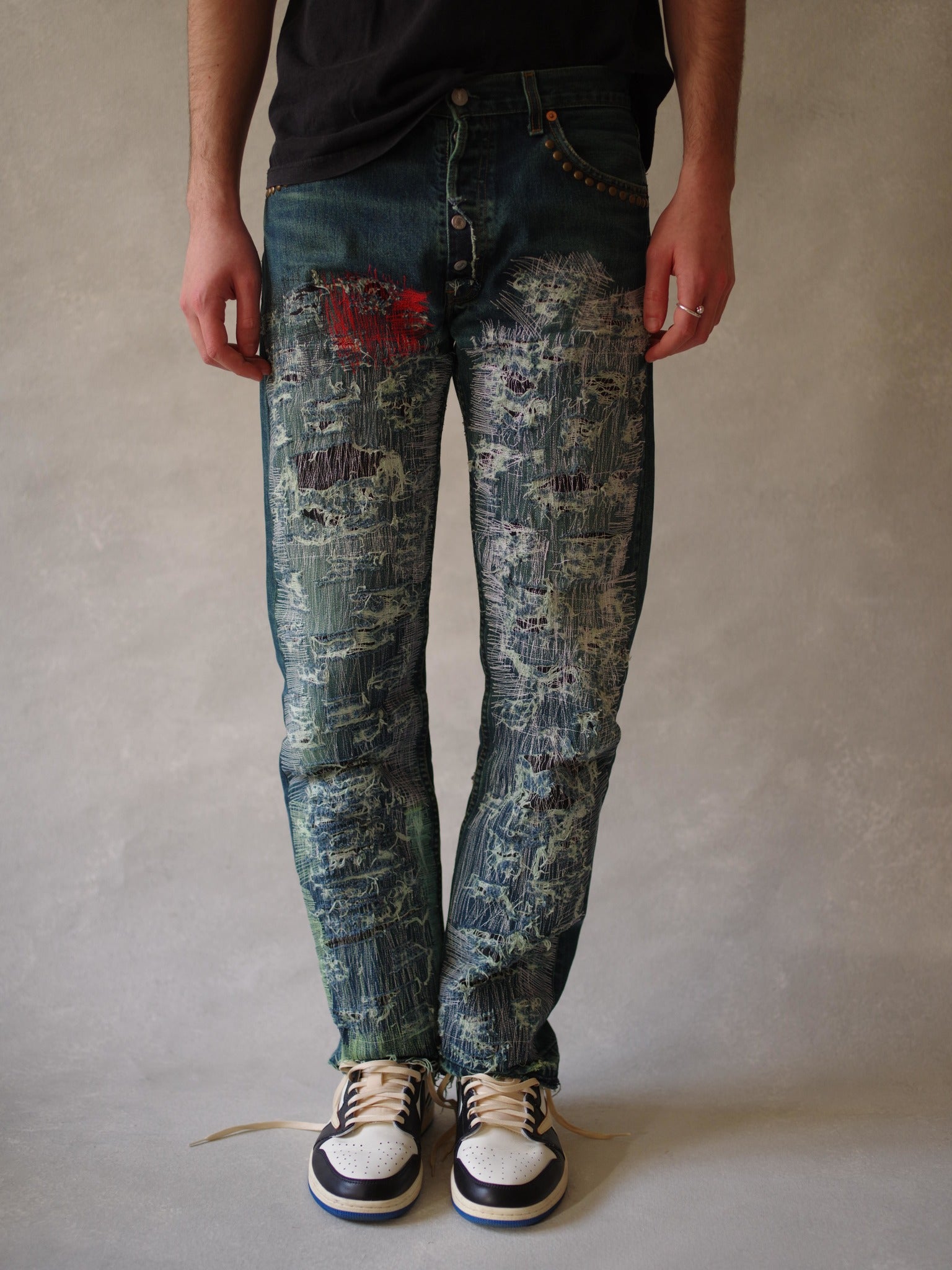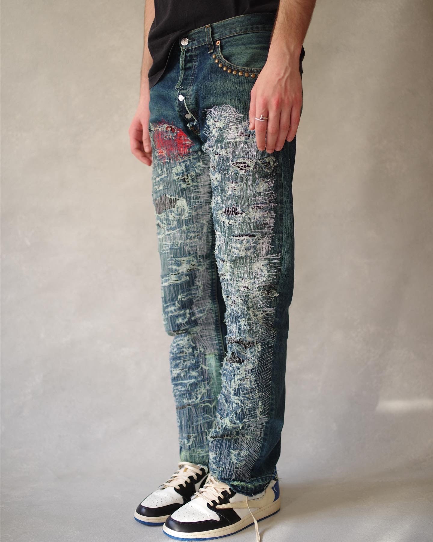 Hand-cut from vintage Levi's denim that's distressed, and repaired over hours of craftsmanship.